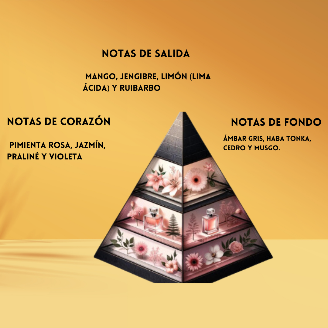 Notas de Salida: Mango, jengibre, limón, frutos rojos.
