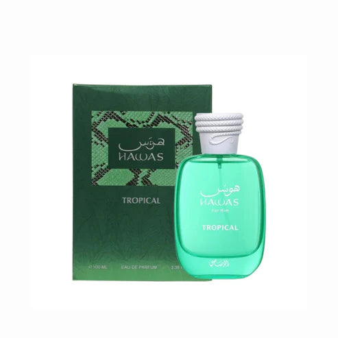 Hawas Tropical es el lado más fresco y exótico de Rasasi: un perfume que combina lo verde, lo frutal y lo cremoso en un aroma único que te transporta a un paraíso tropical.